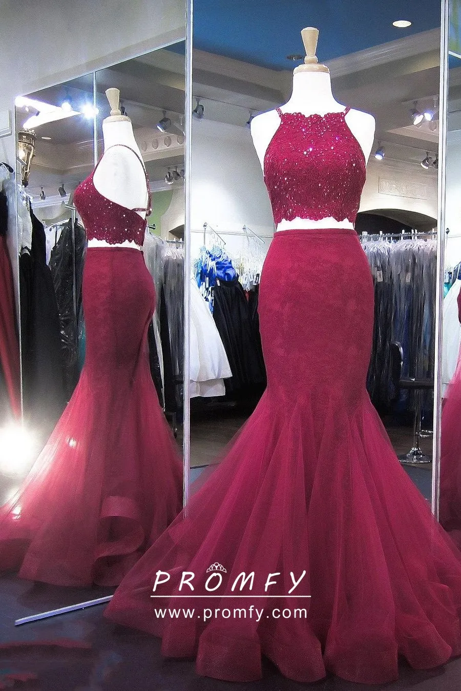 Beaded Lace Maroon Long Trumpet Two Piece Prom Gown Promfy